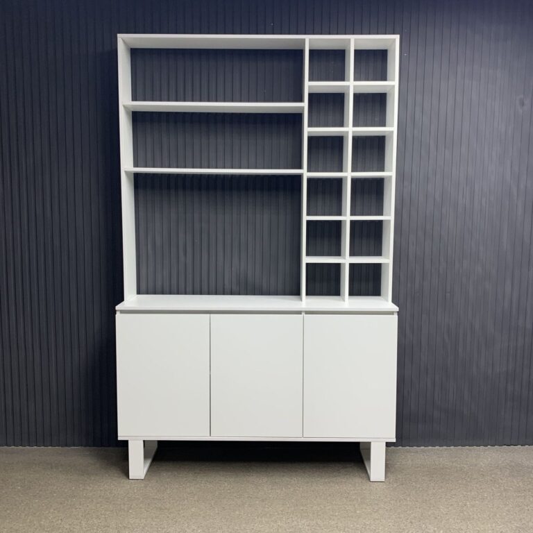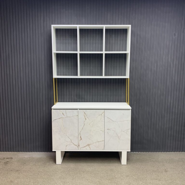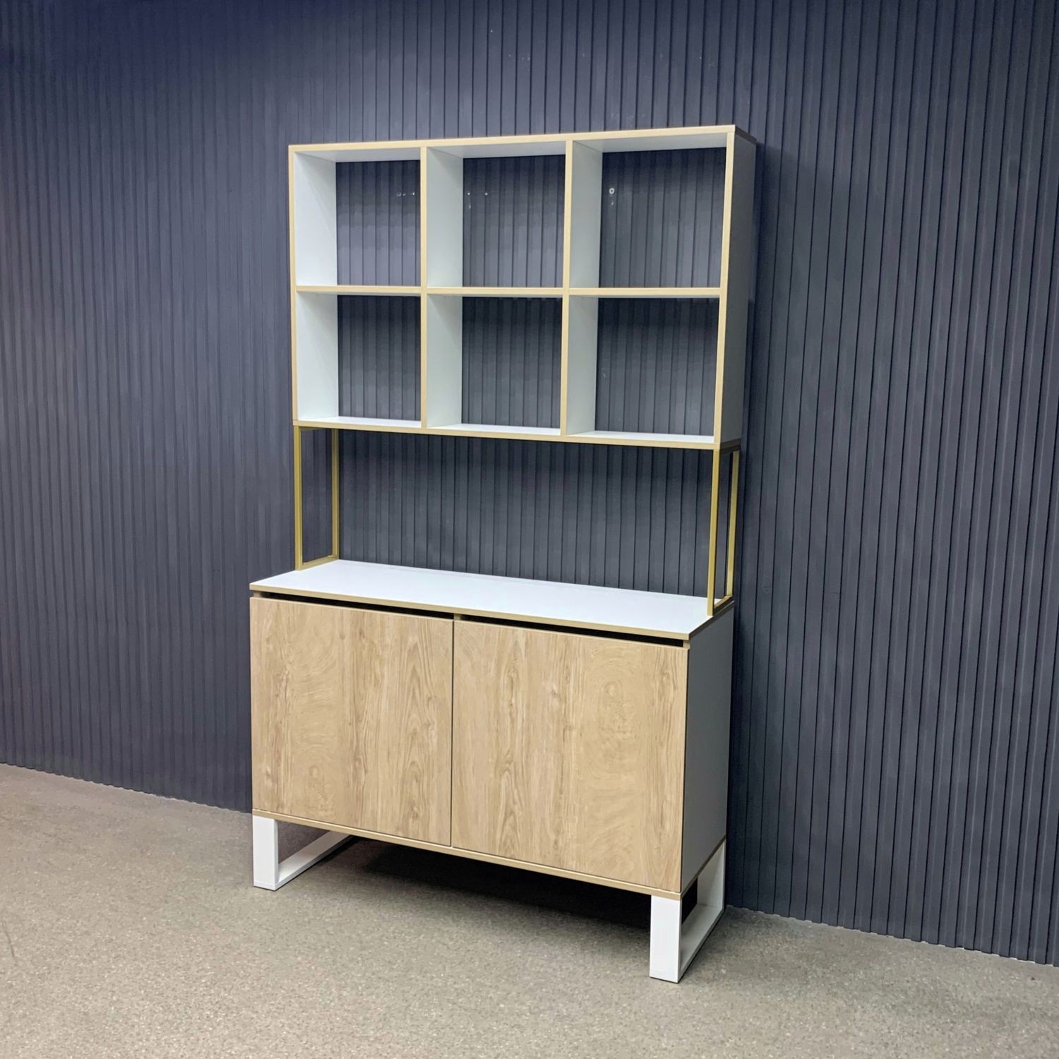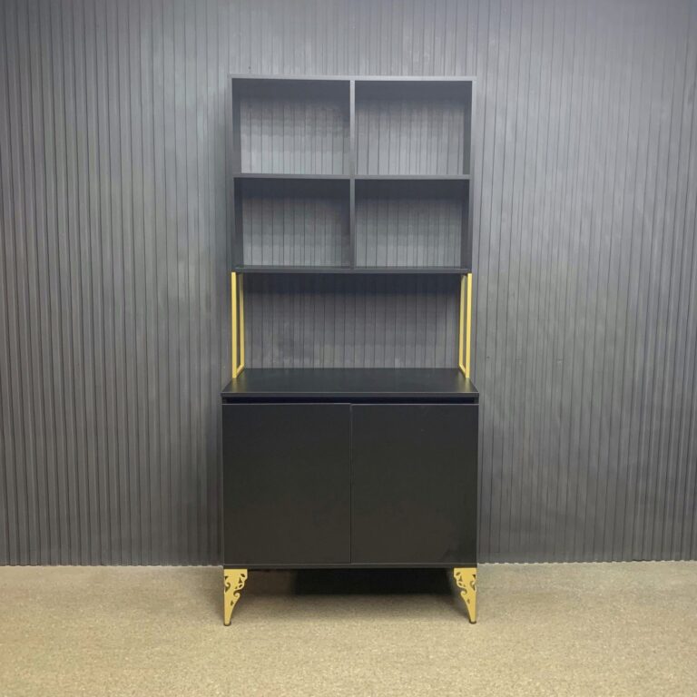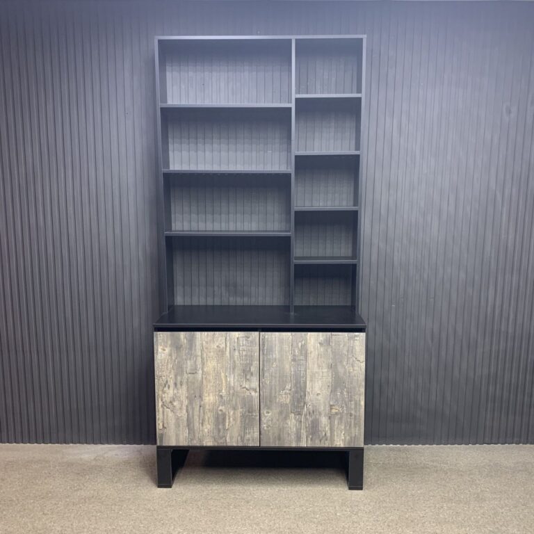 Витрина выполнена в современном лофт-дизайне и сочетает открытые полки для косметики и аксессуаров с закрытыми отделениями для инструментов, поддерживая порядок на рабочем месте. Верхняя часть с пятью полками обеспечивает лёгкий доступ к необходимым предметам, а нижние секции с дверцами скрывают материалы, делая пространство аккуратным и функциональным.