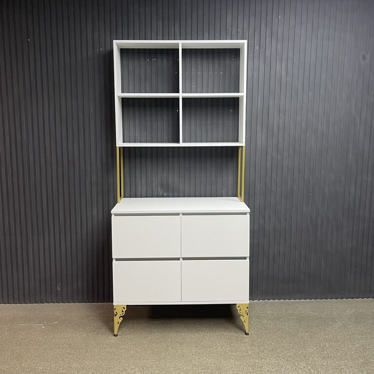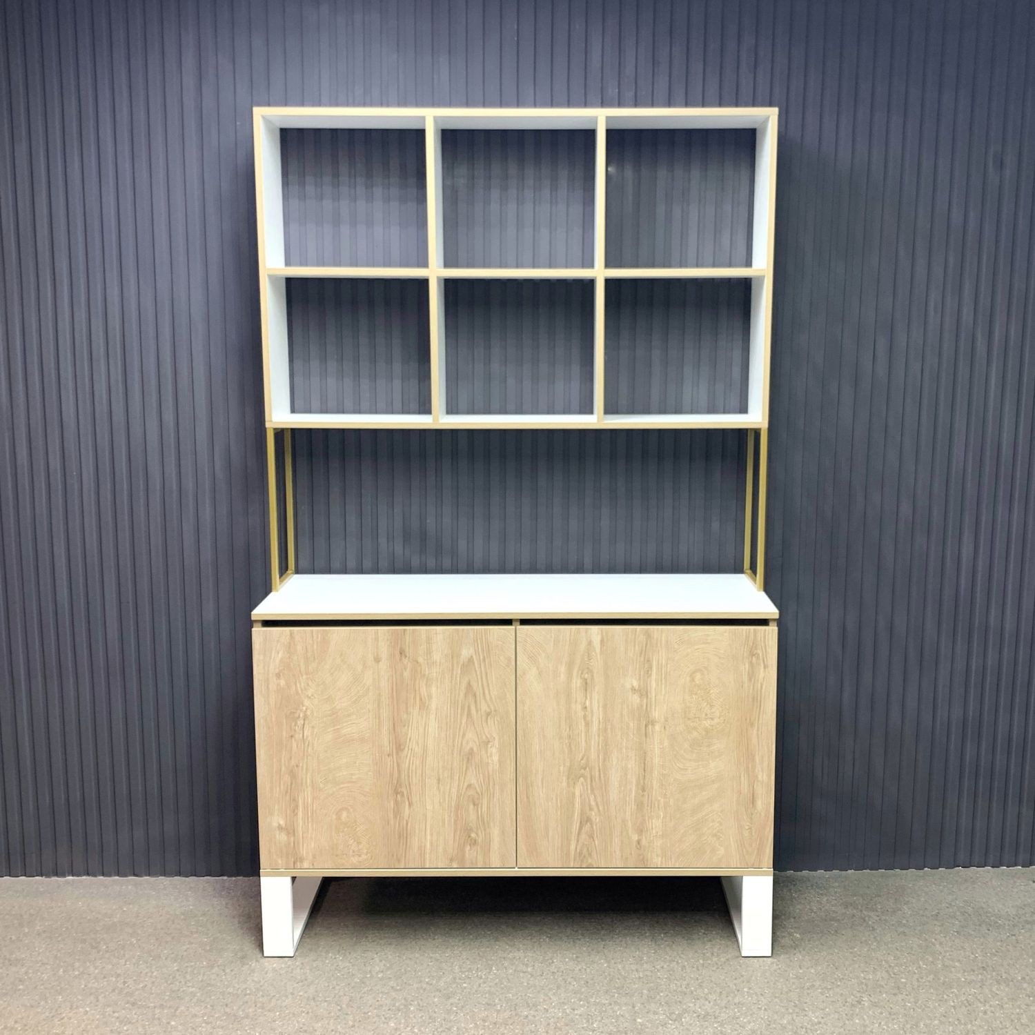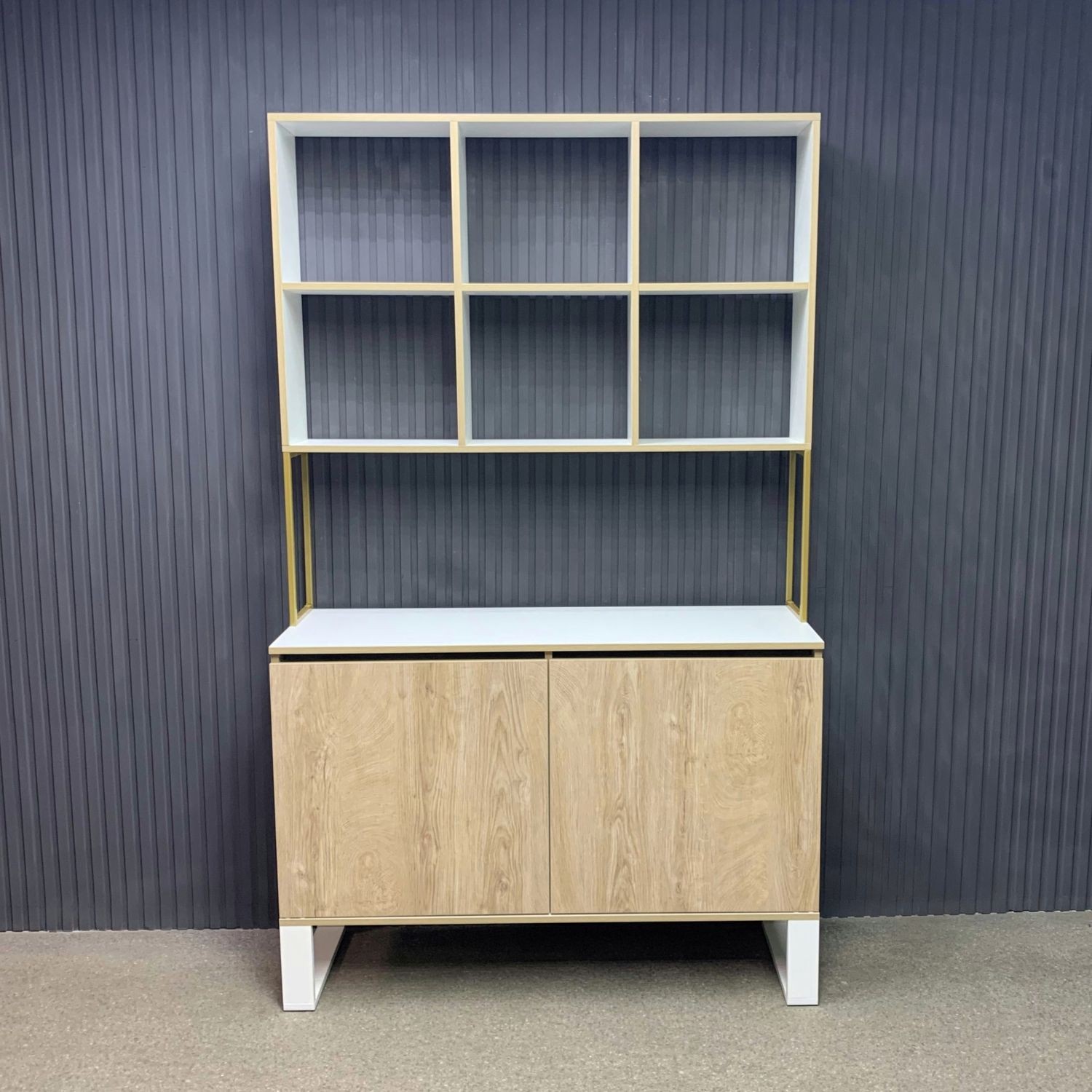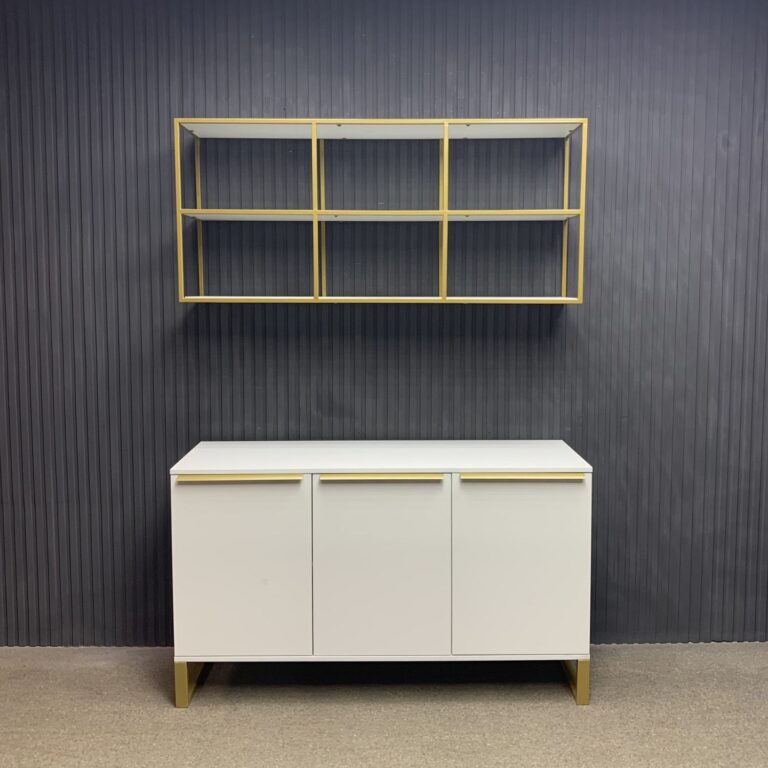 Витрина выполнена в современном лофт-дизайне и сочетает открытые полки для косметики и аксессуаров с закрытыми отделениями для инструментов, поддерживая порядок на рабочем месте. Верхняя часть с пятью полками обеспечивает лёгкий доступ к необходимым предметам, а нижние секции с дверцами скрывают материалы, делая пространство аккуратным и функциональным.