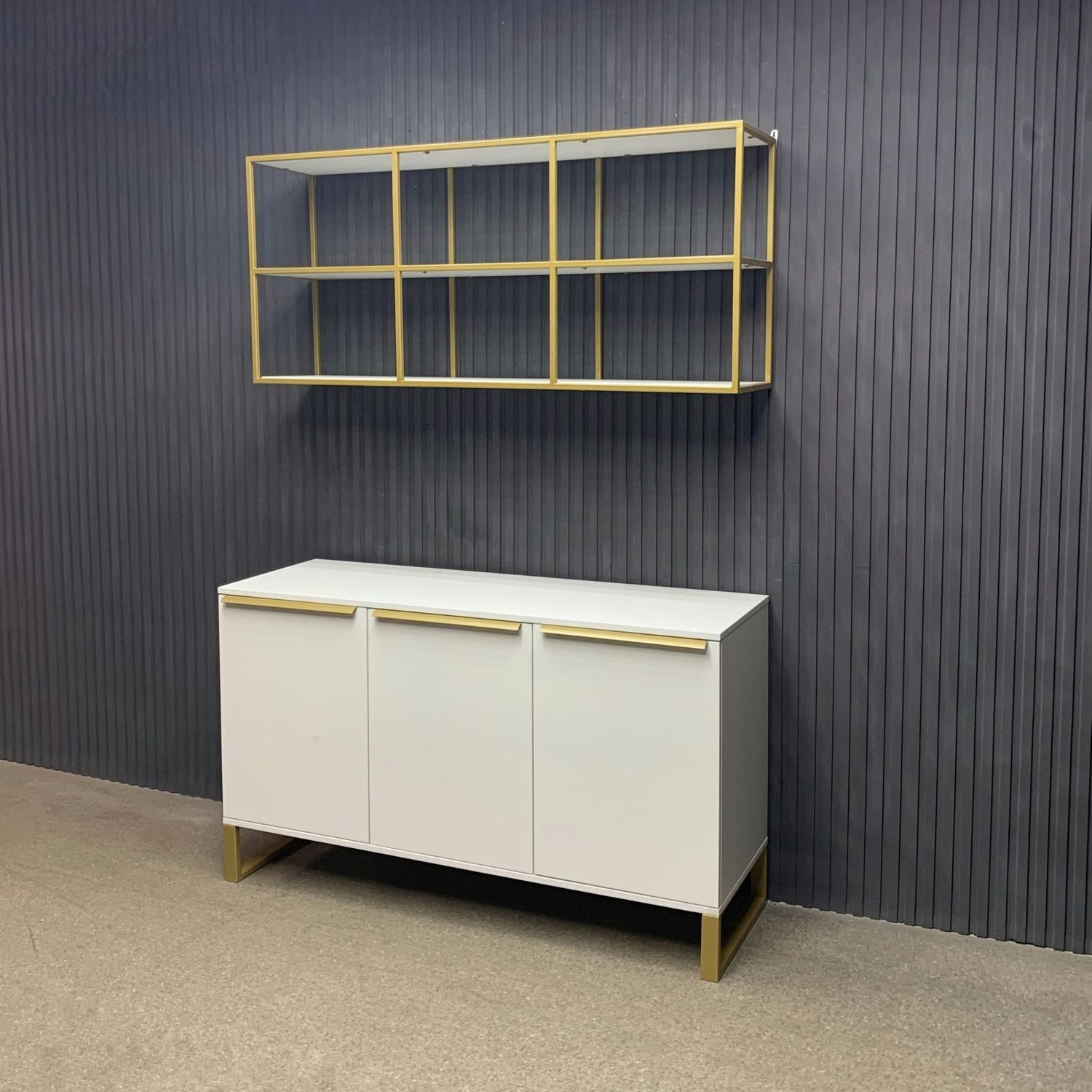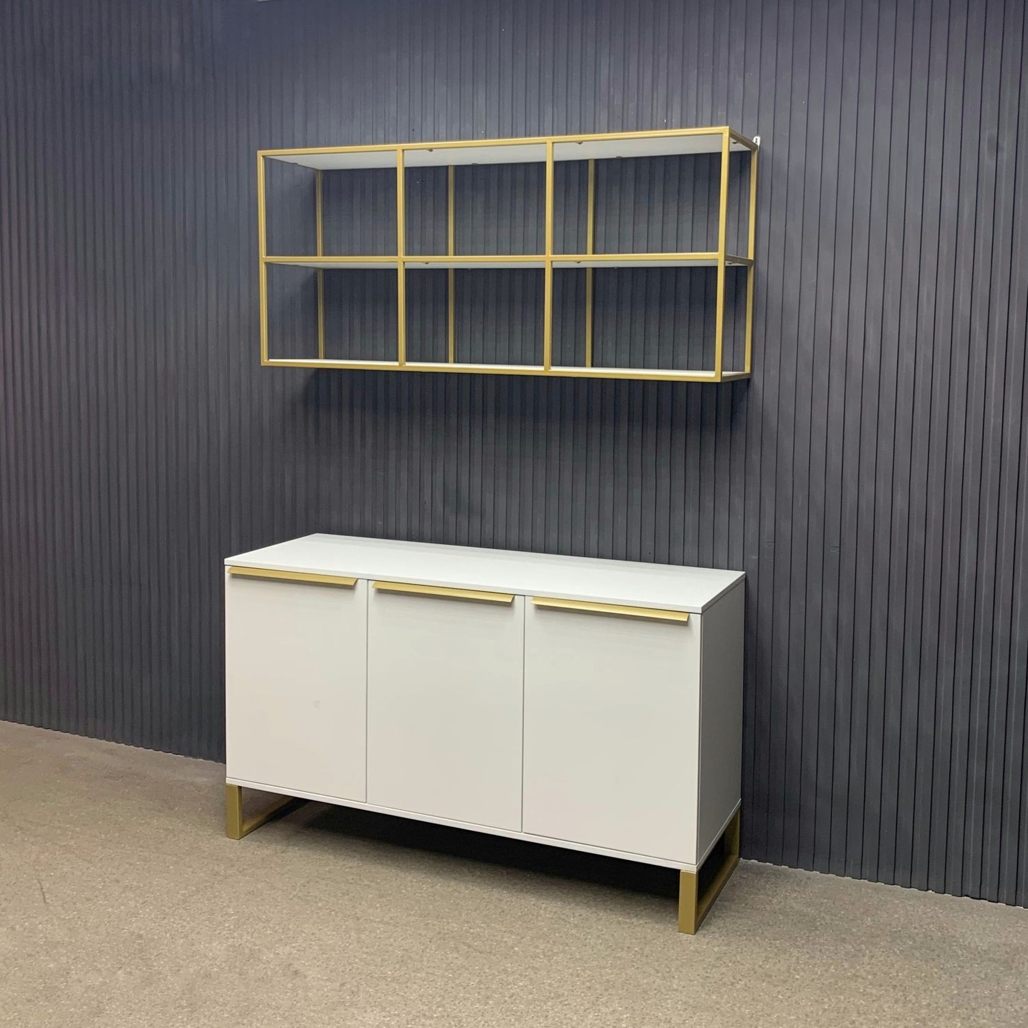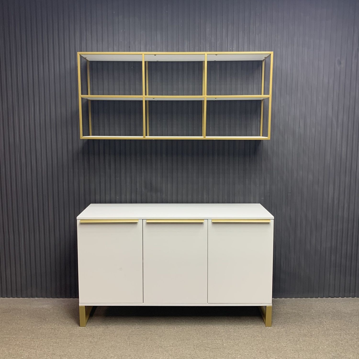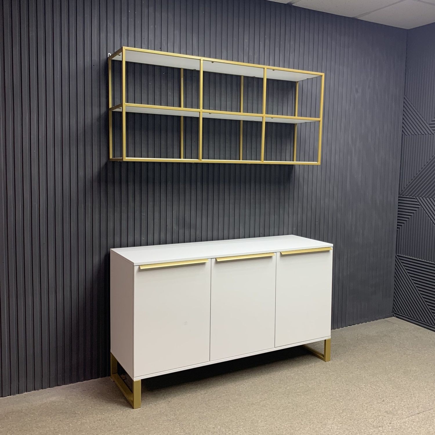 Белые фасады с металлическими золотыми вставками создают стильный и элегантный вид, который не перегружает интерьер. Верхние открытые полки позволяют удобно разместить косметику и аксессуары, а нижние закрытые секции скрывают все лишнее, поддерживая порядок и чистоту рабочего пространства.