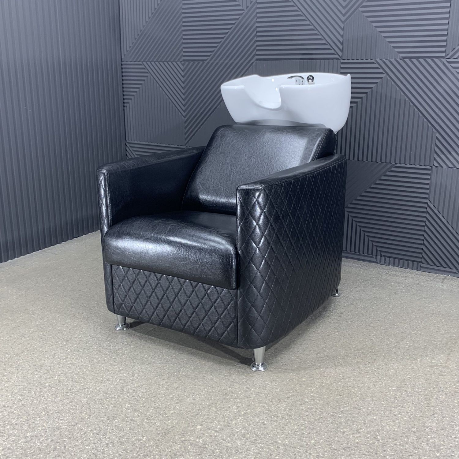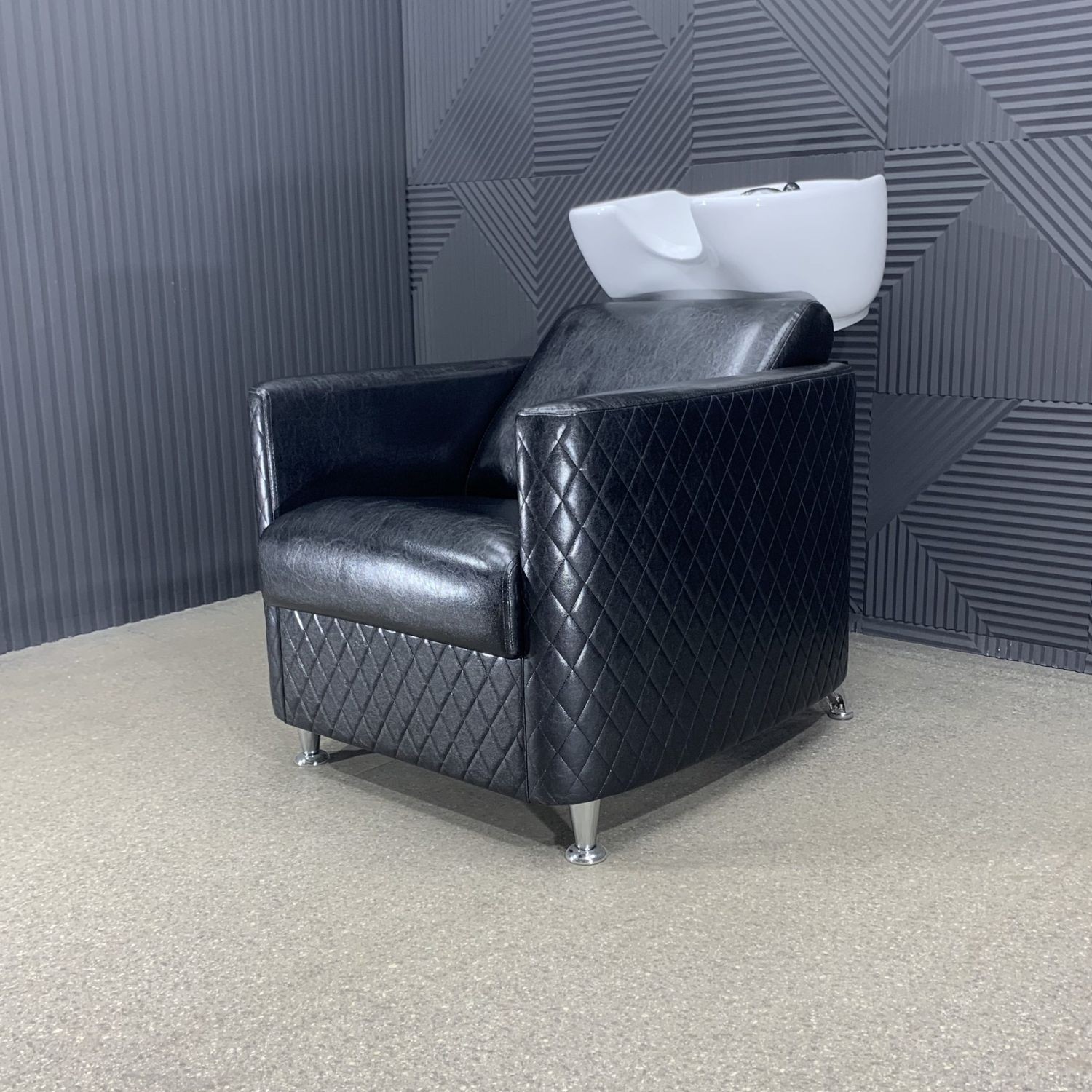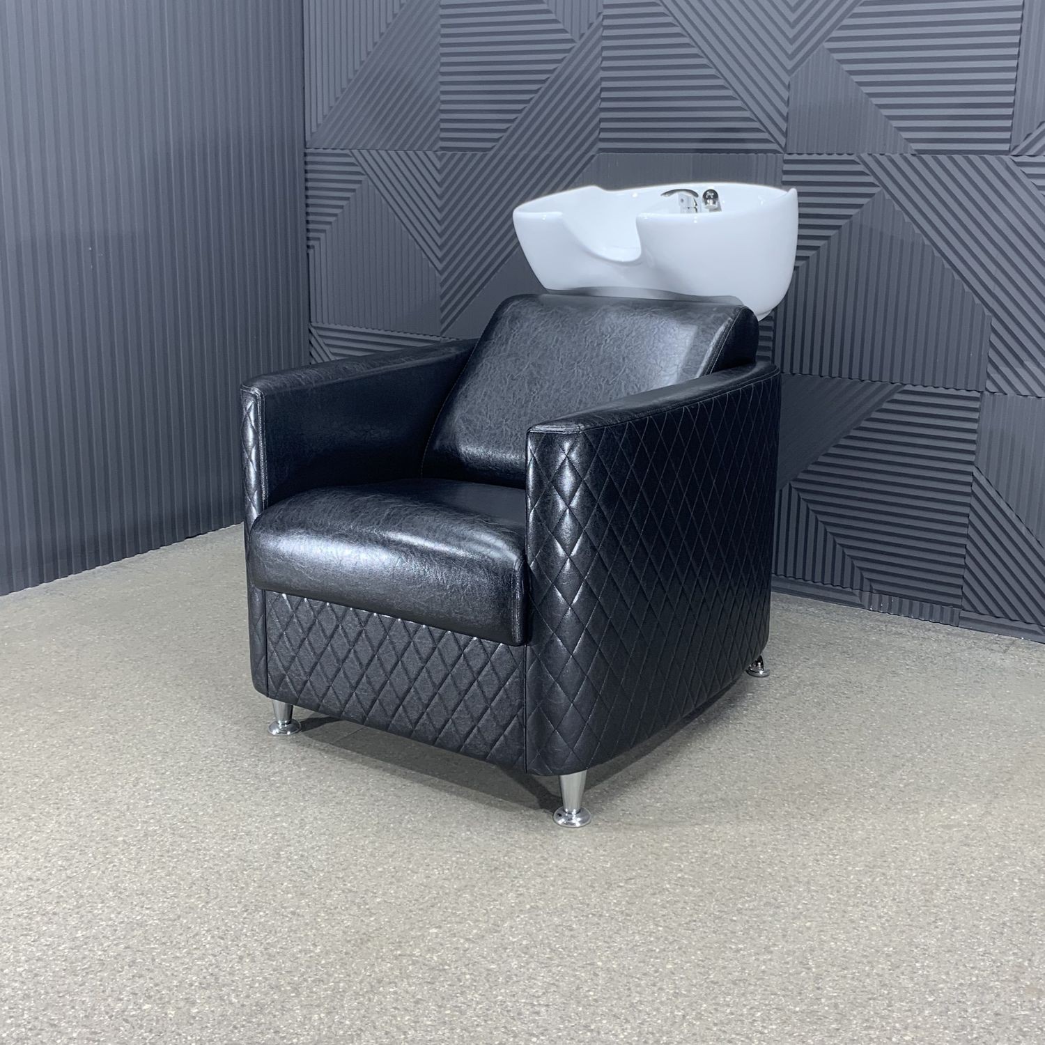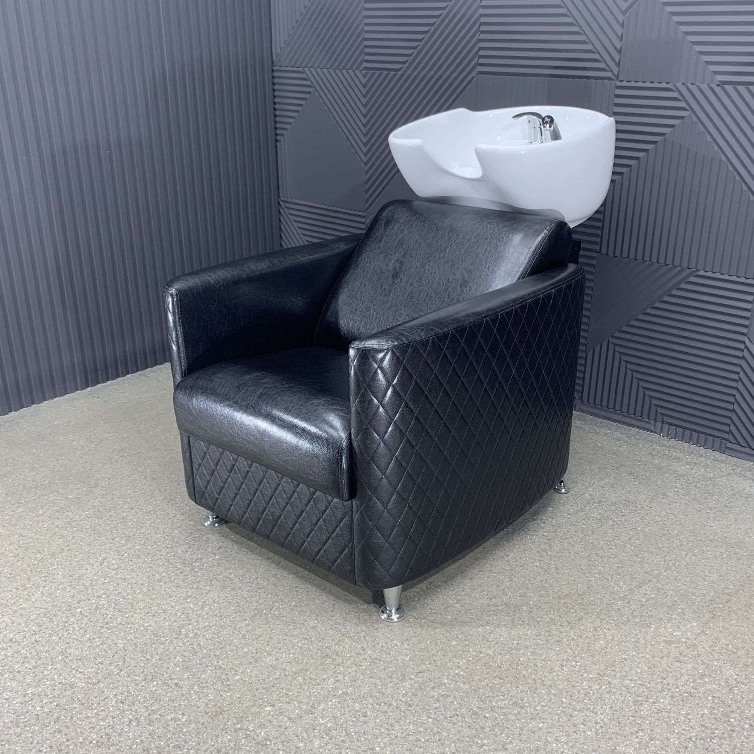 Эргономичное кресло с мягкой обивкой из износостойкого кожзама обеспечивает комфорт клиенту на протяжении всей процедуры, а глубокая керамическая чаша с регулировкой наклона облегчает работу мастера. Прочный металлический каркас гарантирует долговечность, а ромбовидная прострочка придает модели элегантный и премиальный вид.