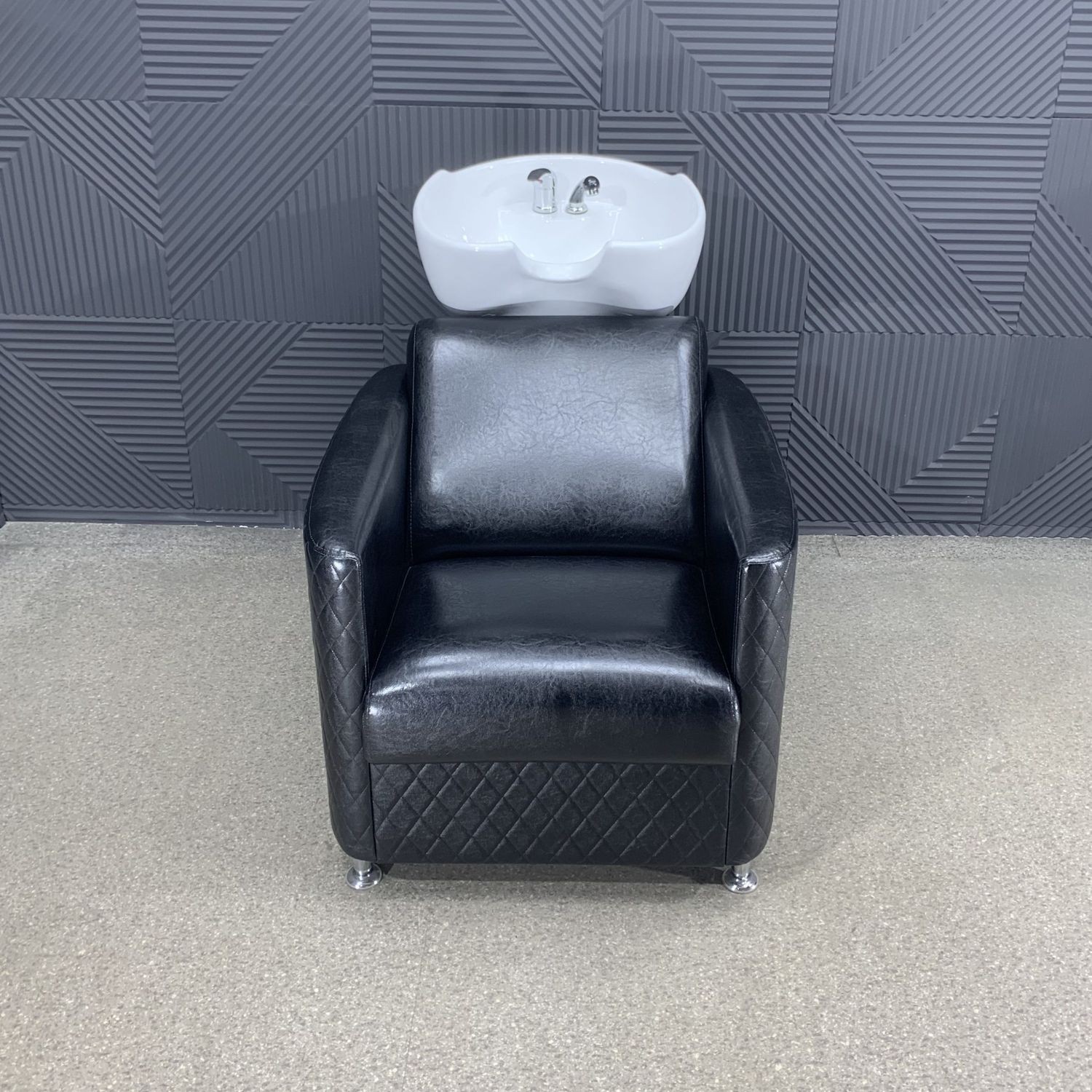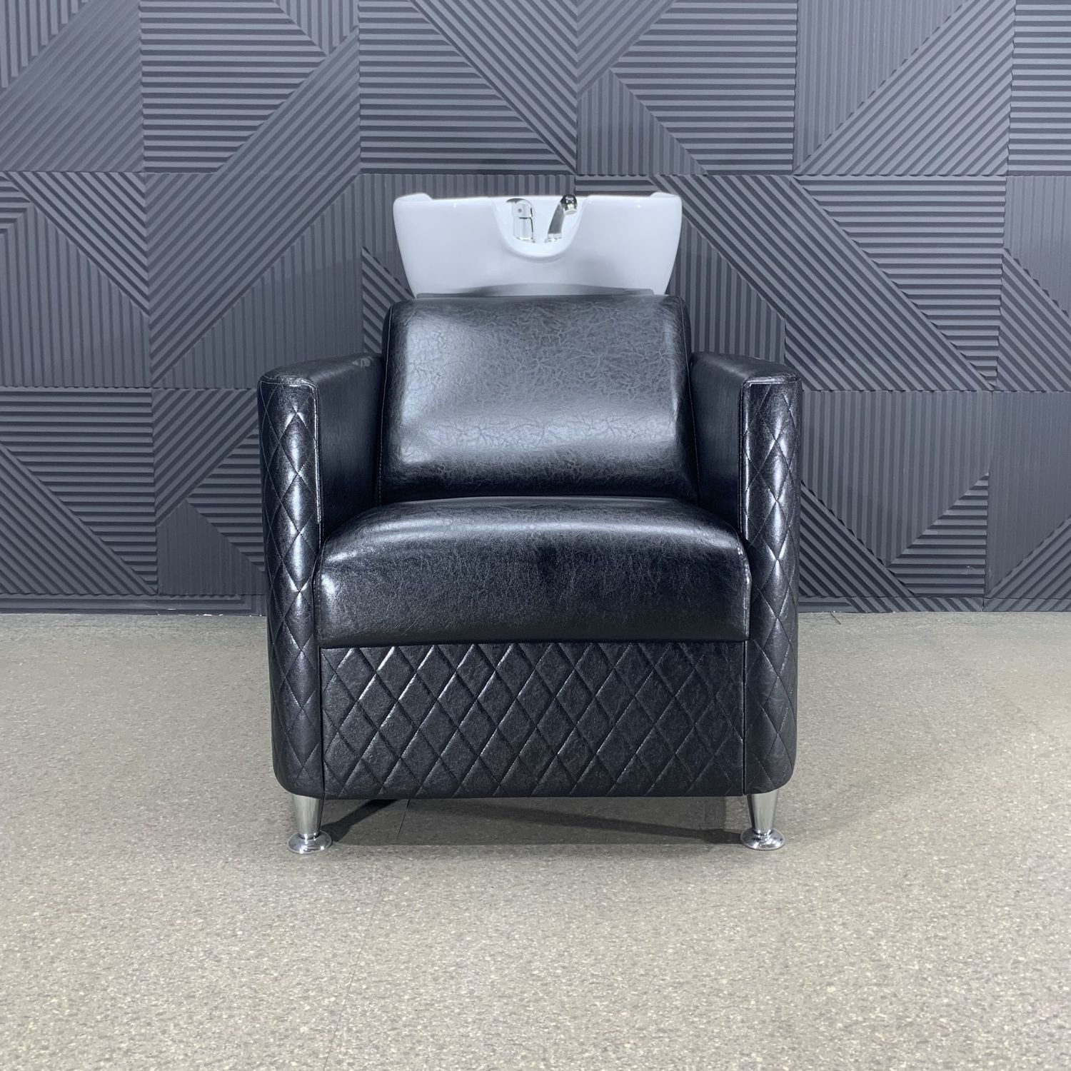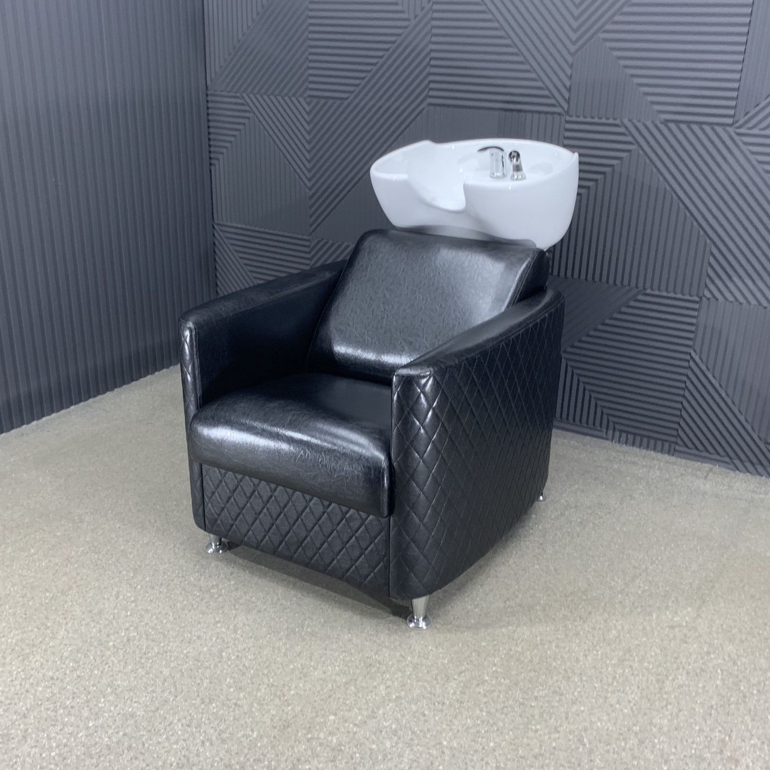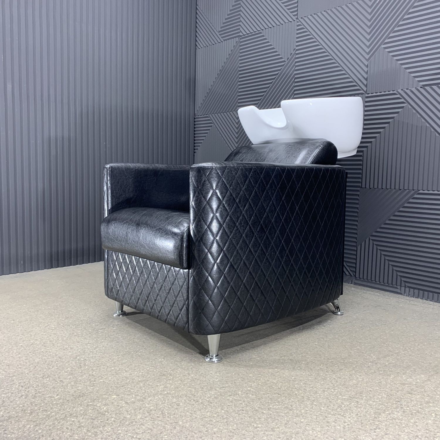 Эргономичное кресло с мягкой обивкой из износостойкого кожзама обеспечивает комфорт клиенту на протяжении всей процедуры, а глубокая керамическая чаша с регулировкой наклона облегчает работу мастера. Прочный металлический каркас гарантирует долговечность, а ромбовидная прострочка придает модели элегантный и премиальный вид.