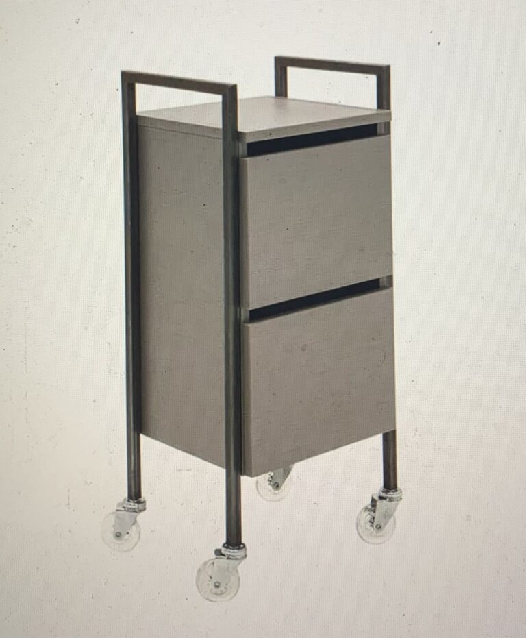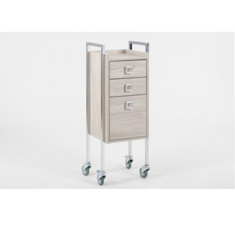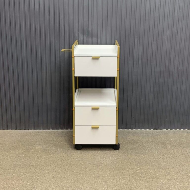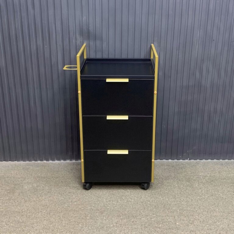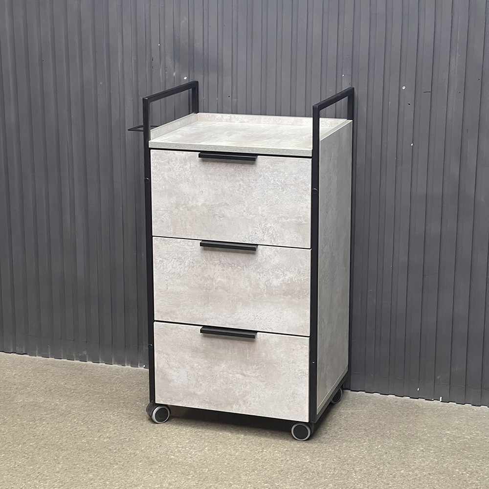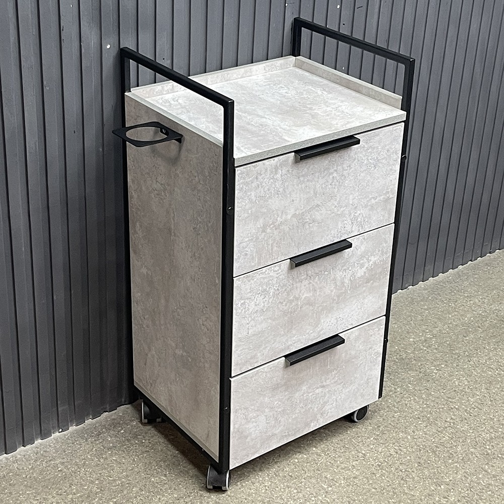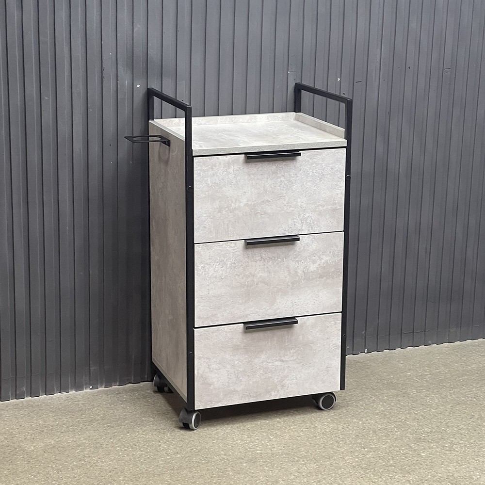 Модель выполнена в минималистичном стиле: чёрный металлический каркас подчёркивает строгие линии, а фасады под бетон придают мебели стильный индустриальный вид. Три вместительных ящика обеспечивают удобное хранение инструментов и косметики, а фенодержатель помогает поддерживать порядок на рабочем месте. Прочные колёса позволяют легко перемещать тележку по салону.