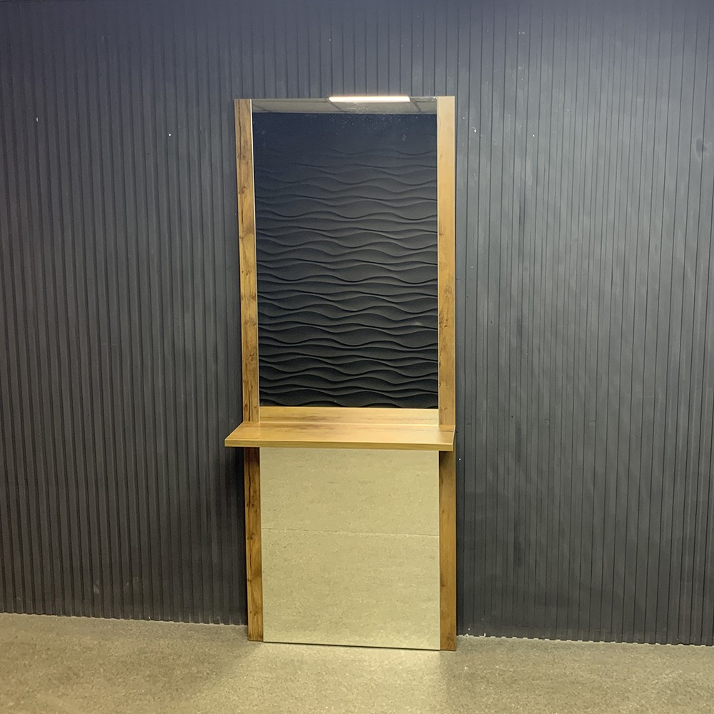 Эта модель оборудована встроенным рабочим столиком и удобной полкой для аксессуаров, что помогает мастеру поддерживать порядок и иметь всё необходимое под рукой. Зеркало даёт чёткое отражение без искажений, обеспечивая комфортную работу даже при длительных процедурах. Тёмная деревянная рама с текстурой натурального дерева придаёт изделию солидность и уют, гармонично сочетаясь с интерьером в стиле лофт или модерн.
