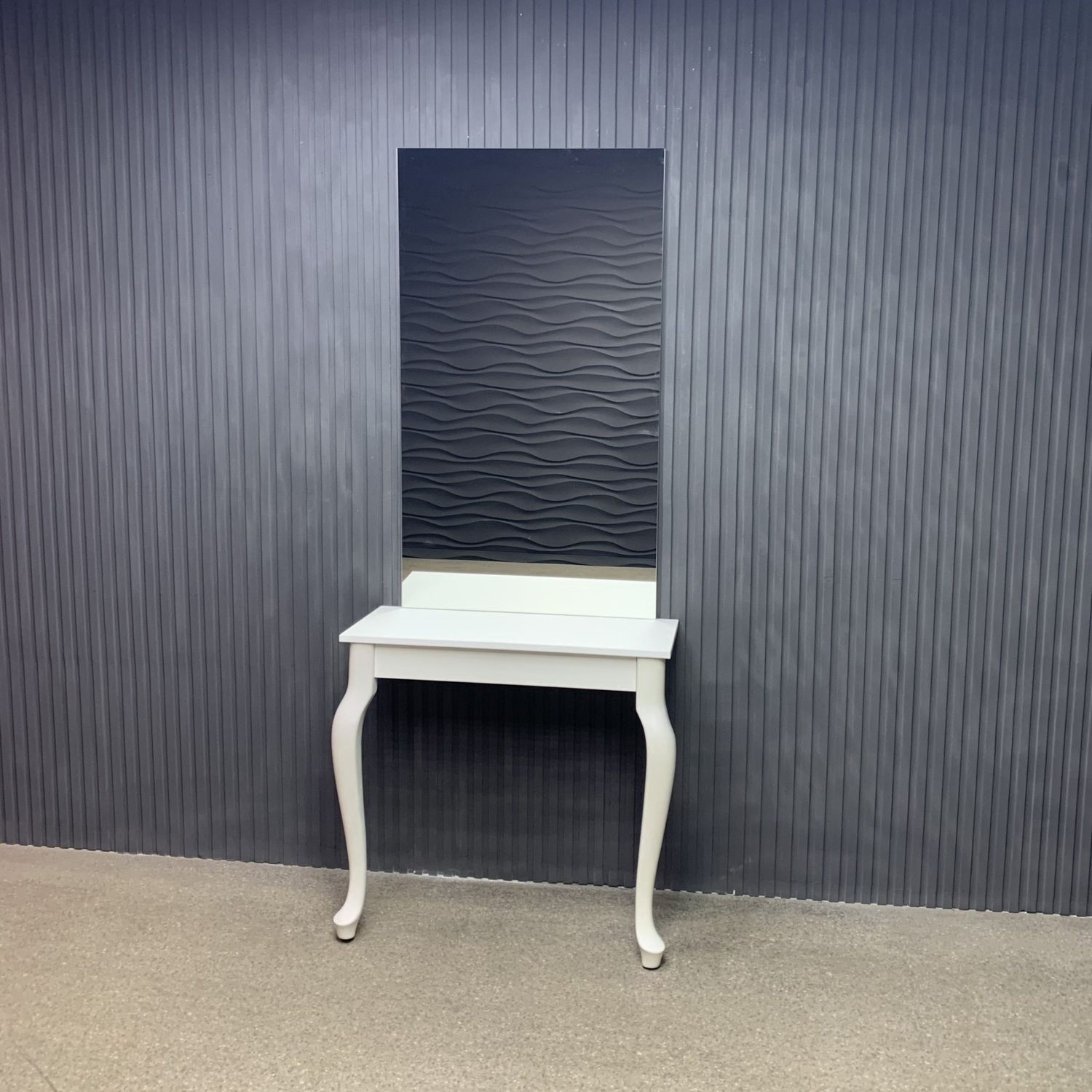 Эта модель с белой рамой, изогнутыми ножками и плавными линиями словно создана, чтобы подчеркнуть утончённость классического стиля. Широкое зеркало обеспечивает чёткое отражение без искажений, а встроенная полка позволяет удобно разместить аксессуары, инструменты и косметику. Каждая деталь продумана до мелочей — от устойчивой конструкции до декоративных элементов.
