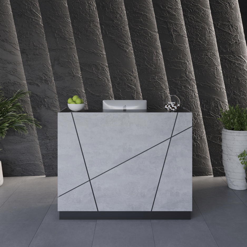Элегантная стойка выполнена в стиле «лофт-модерн» с геометрическим рисунком и матовой фактурой, имитирующей бетон. Она идеально подходит для салонов красоты, спа-центров, барбершопов и офисов. Конструкция сочетает прочность, устойчивость и продуманную эргономику: за фасадом предусмотрено удобное пространство для хранения документов и оборудования.