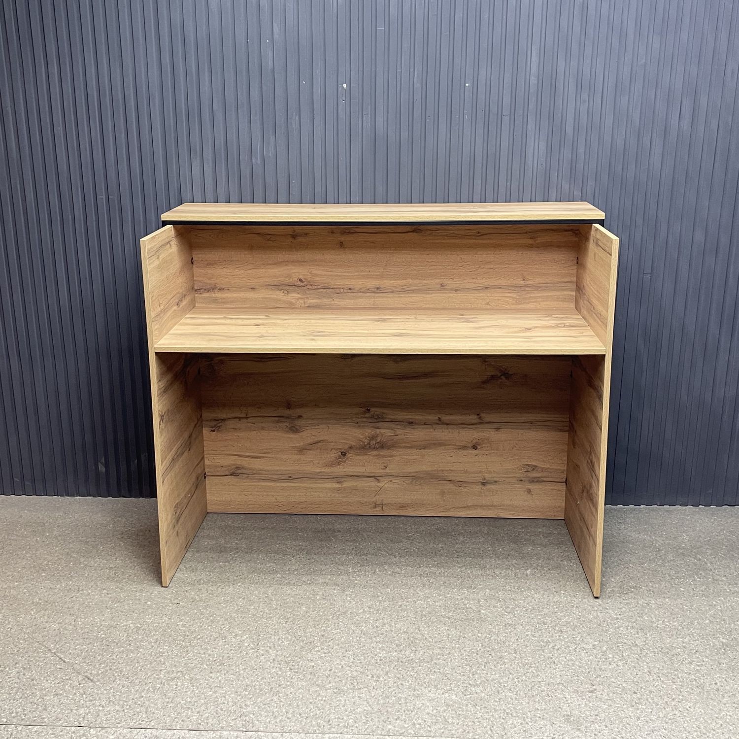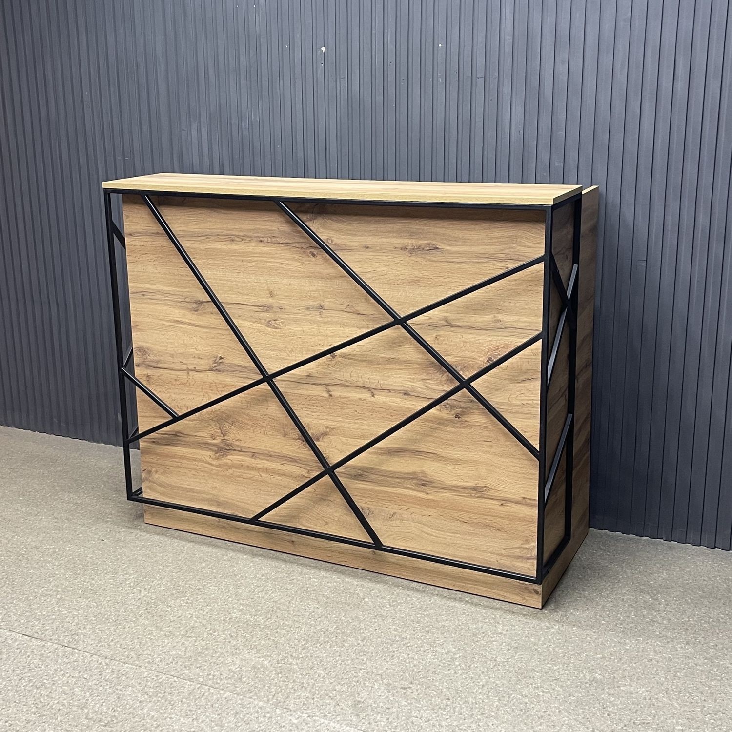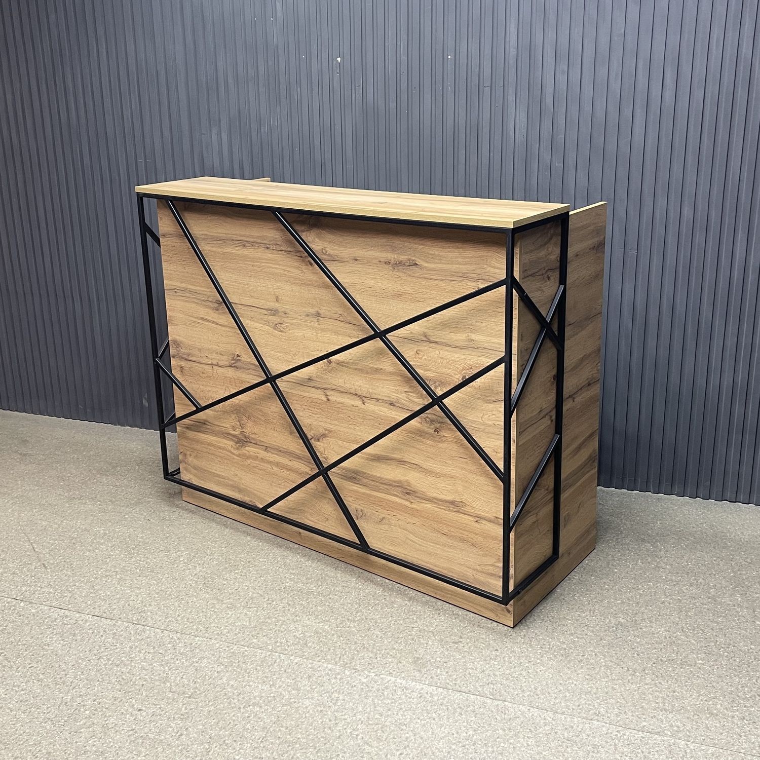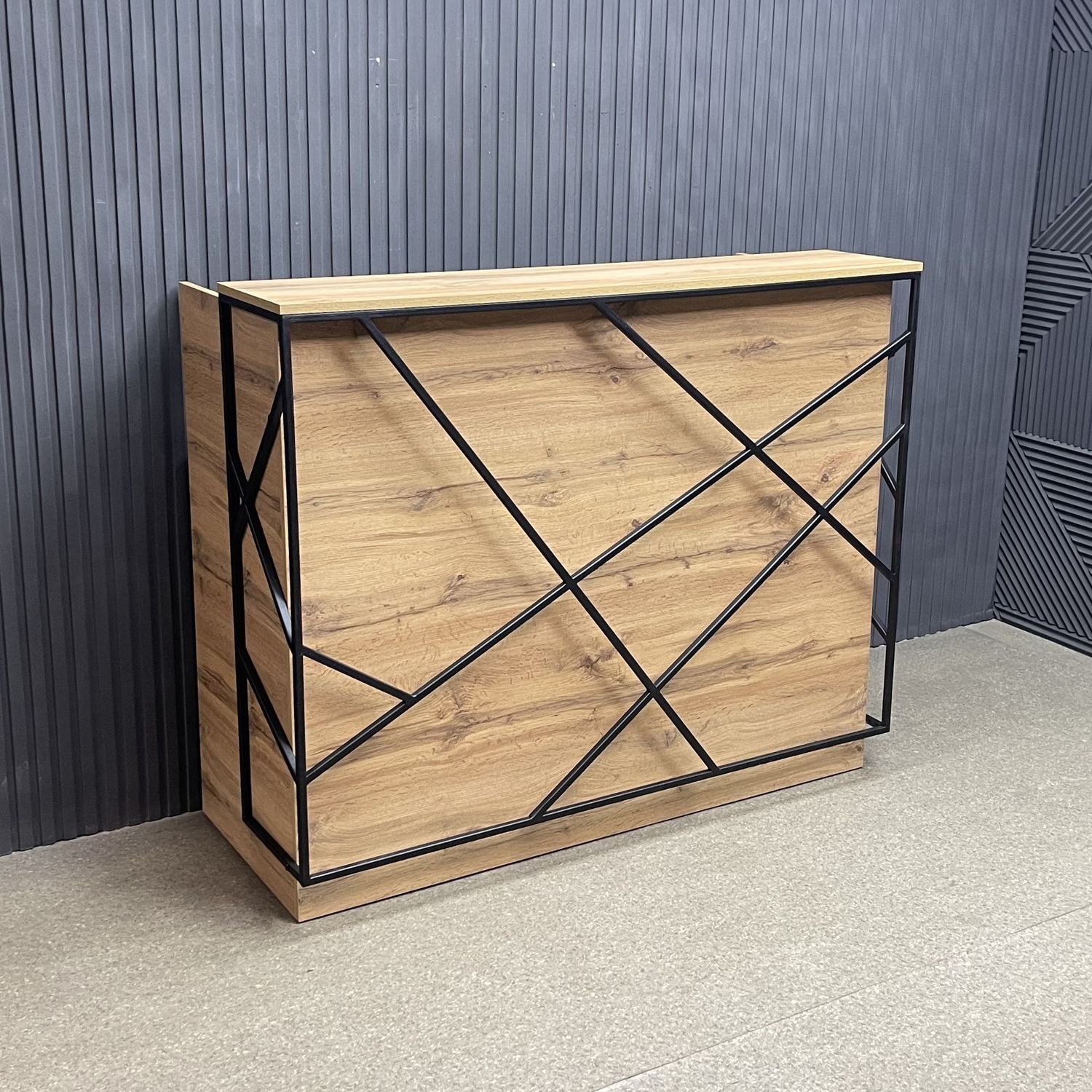 Ее лаконичный дизайн с акцентом на металлические элементы идеально вписывается в современные пространства. Приятная древесная текстура фасадов добавляет тепла, а прочная металлическая рама придаёт устойчивость и долговечность конструкции. Функциональные отсеки позволяют разместить всё необходимое для работы администратора — от журналов и POS-оборудования до личных вещей.