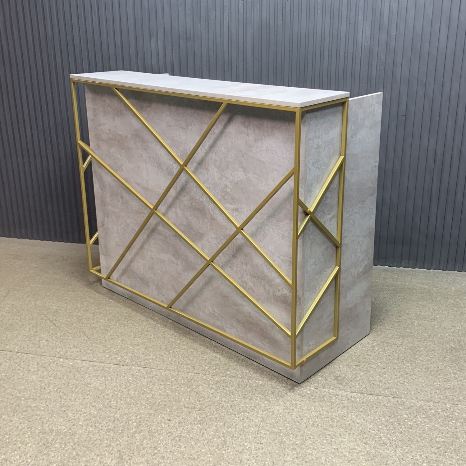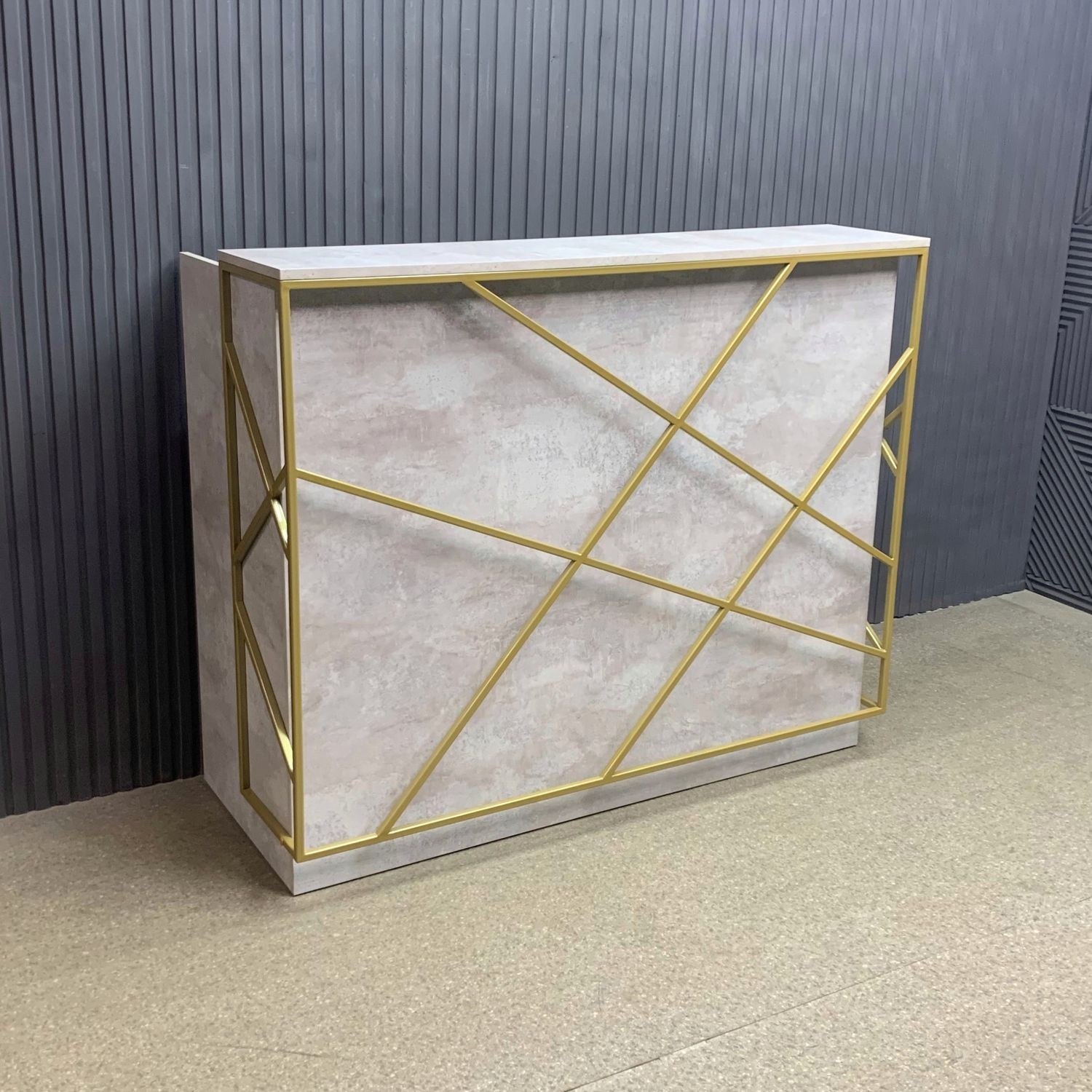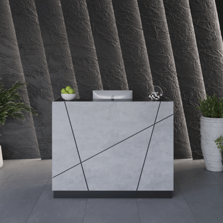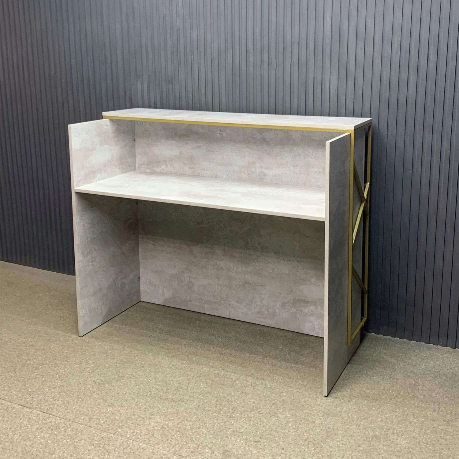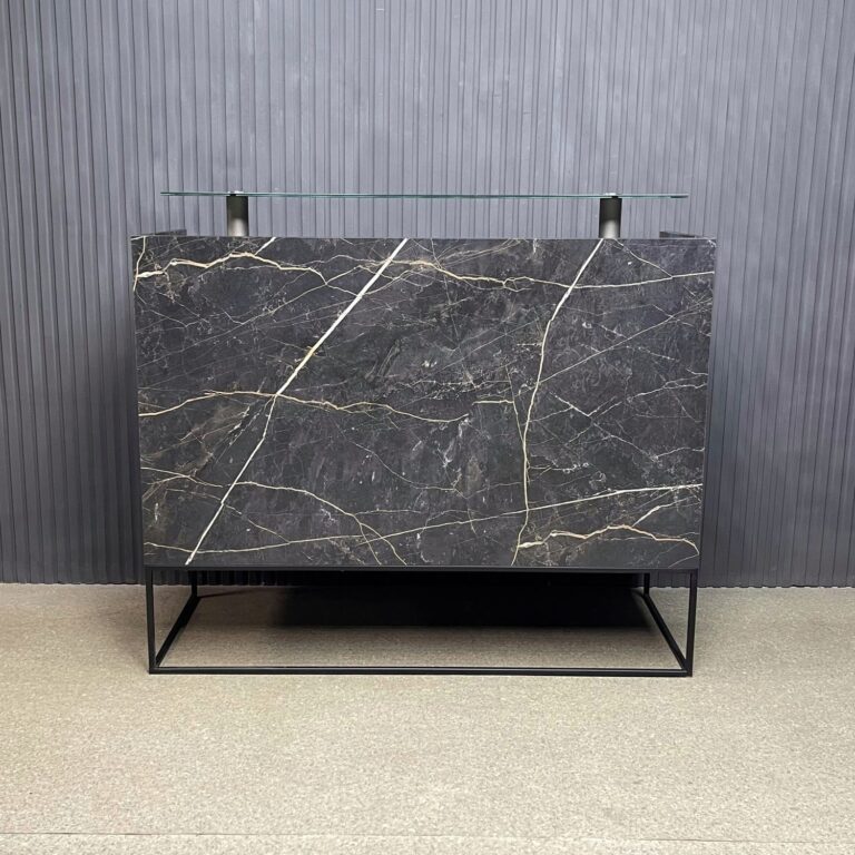 Лаконичный дизайн с золотыми металлическими акцентами идеально вписывается в интерьер в стиле лофт или минимализм. Прочная поверхность устойчива к царапинам и влаге, легко очищается и сохраняет безупречный вид. За стойкой предусмотрено удобное рабочее пространство для администратора: здесь легко разместить документы, кассу и технику.
