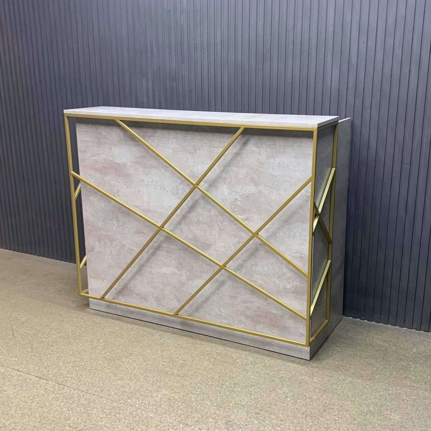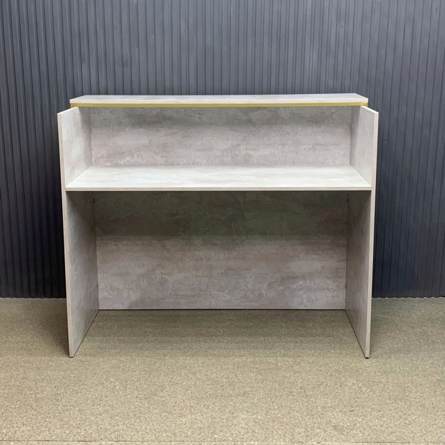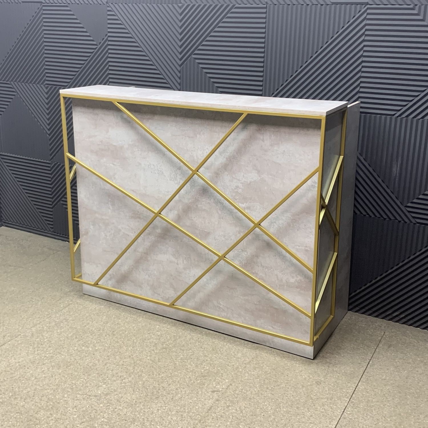 Лаконичный дизайн с золотыми металлическими акцентами идеально вписывается в интерьер в стиле лофт или минимализм. Прочная поверхность устойчива к царапинам и влаге, легко очищается и сохраняет безупречный вид. За стойкой предусмотрено удобное рабочее пространство для администратора: здесь легко разместить документы, кассу и технику.