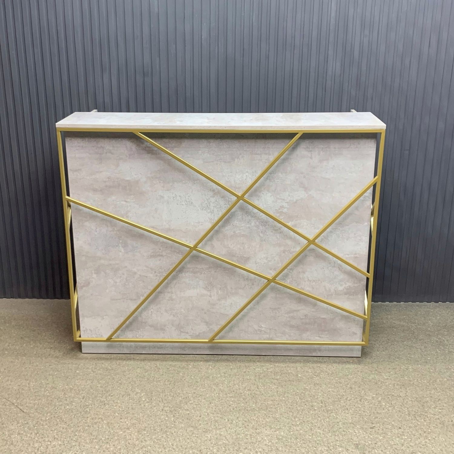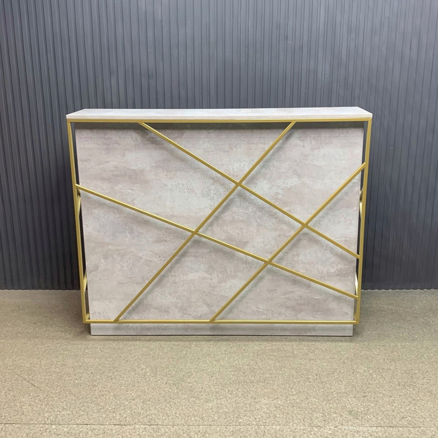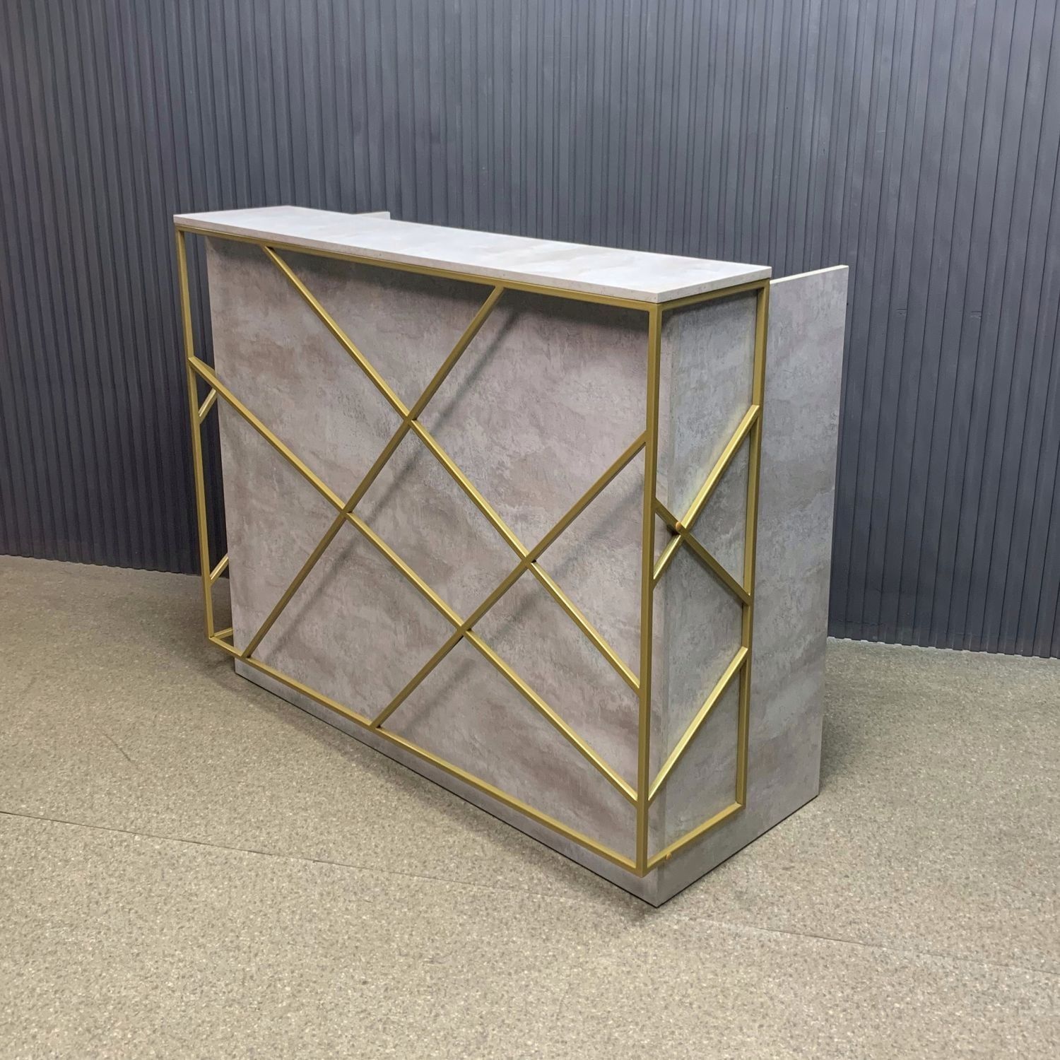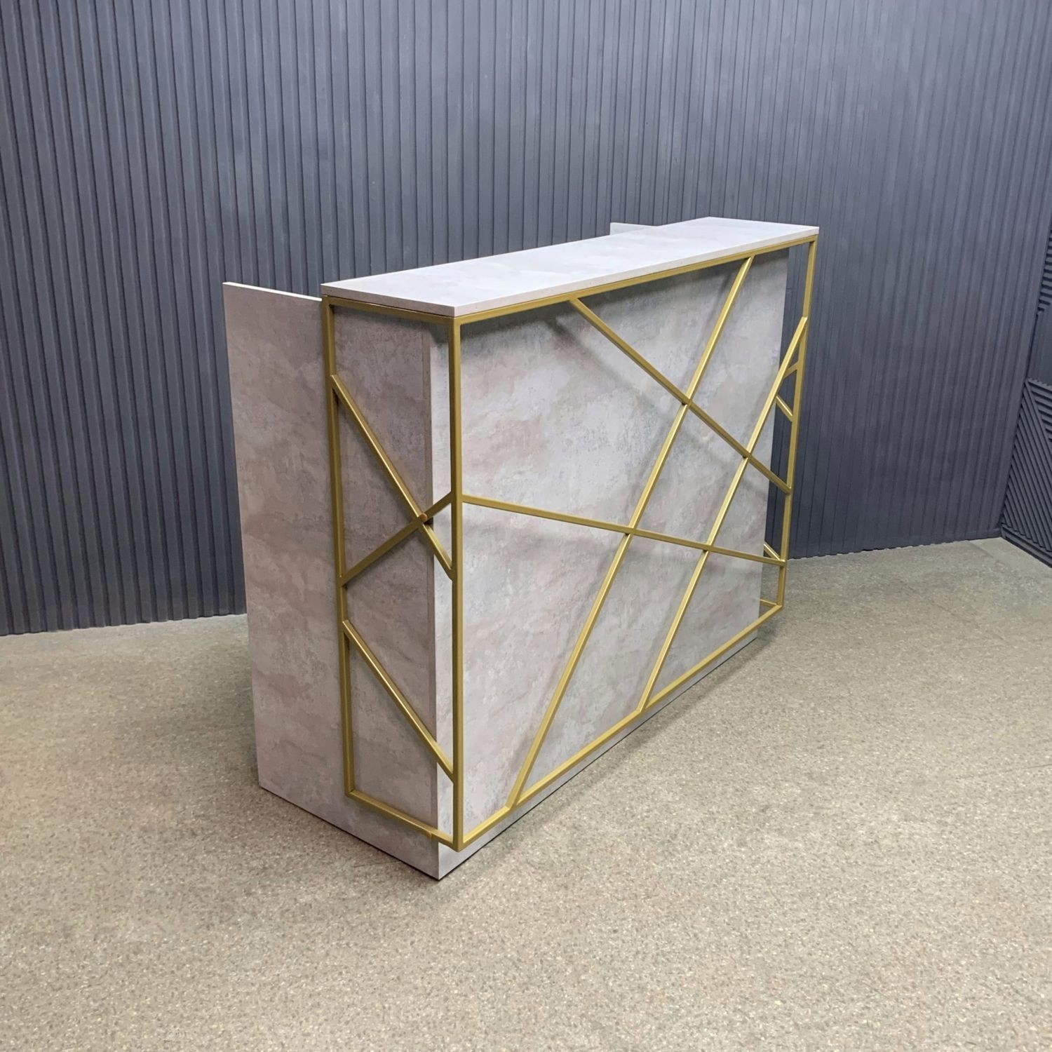 Лаконичный дизайн с золотыми металлическими акцентами идеально вписывается в интерьер в стиле лофт или минимализм. Прочная поверхность устойчива к царапинам и влаге, легко очищается и сохраняет безупречный вид. За стойкой предусмотрено удобное рабочее пространство для администратора: здесь легко разместить документы, кассу и технику.